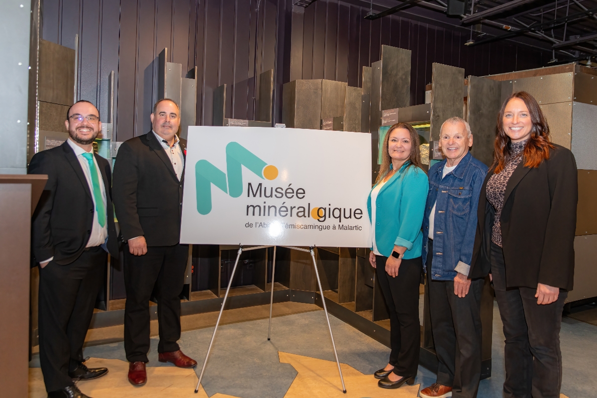 Sur la photo, de gauche à droite : Maxime Bolduc, coordonnateur des expositions et responsable du développement de projets du Musée, Martin Ferron, maire de la Ville de Malartic, Chantal Moore, directrice et conservatrice du Musée, Michel Létourneau, président du conseil d'administration du Musée, et Ginette Turcotte, stratège marketing et fondatrice d'Imagine – boîte de pub.