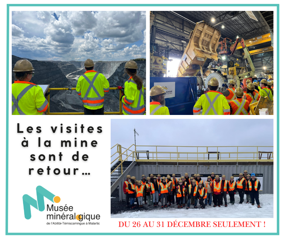 Bonne nouvelle : les visites guidées à la mine Canadian Malartic reprennent du service pendant le congé des Fêtes ! Durant la semaine du 26 au 31 décembre 2025, une visite par jour sera offerte, à 13h30. Il s’agit d’une occasion en or de découvrir la mine en hiver : l’activité n’est habituellement offerte que durant la saison estivale.