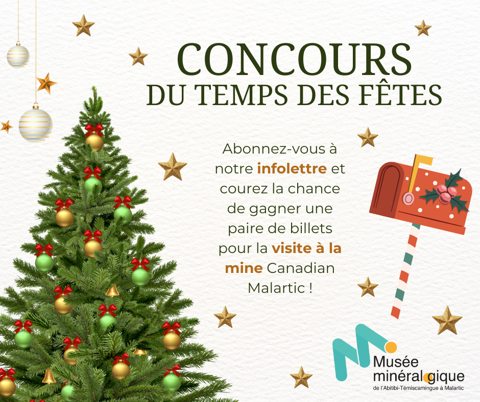Nous vous proposons aujourd’hui un concours festif vous donnant la chance de gagner une paire de billets pour les visites à la mine Canadian Malartic entre le 26 et le 31 décembre 2025.