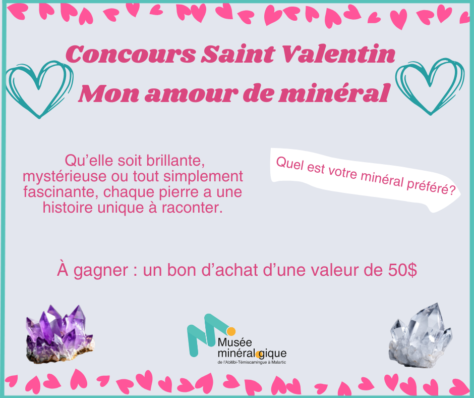 À l’approche de la fête de l’amour, le Musée organise le concours Mon amour de minéral ! En participant, vous courez la chance de gagner un bon d’achat à notre boutique, d’une valeur de 50$.